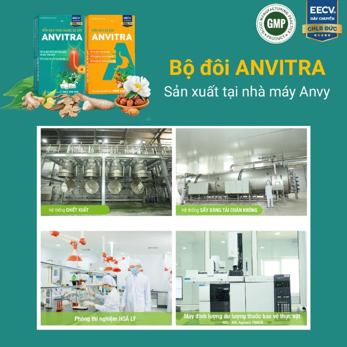 Sản phẩm Thực phẩm bảo vệ sức khoẻ Hỗn dịch dạ dày Anvitra được sản xuất theo công nghệ EECV – Công nghệ tiên tiến, hiện đại hàng đầu châu Âu hiện nay. Hệ thống dây chuyền công nghệ EECV được DEVEX (CHLB Đức) chuyển giao cho nhà máy Anvy với giá trị lên tới 250 tỷ đồng.